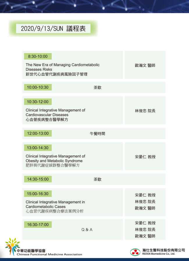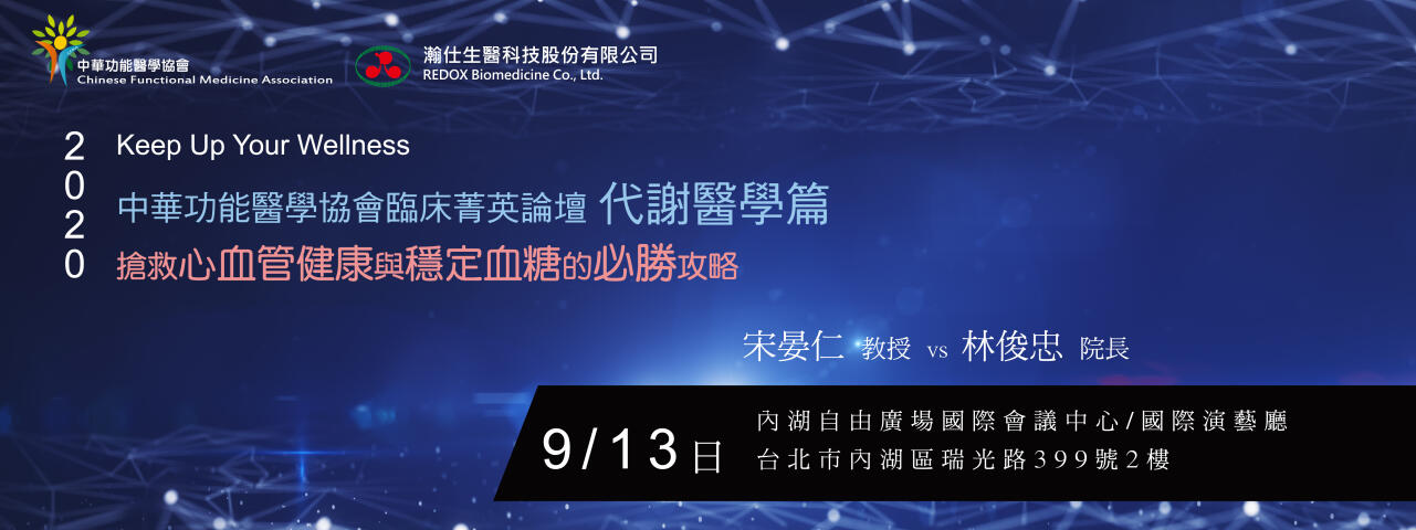 2020/9/13 (日) Keep Up Your Wellness中華功能醫學協會臨床菁英論壇-代謝醫學篇 搶救心血管健康與穩定血糖的必勝攻略