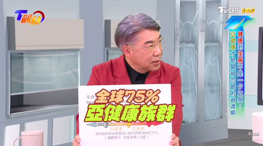 很多人以為沒生病就代表自己很健康,但現在有個名詞叫「亞健康」,也就是身體介於「健康」與「疾病」之間的過渡狀態。歐忠儒博士表示,從健康到疾病的發生要經過20到40年才會形成,這過程卻容易忽略「功能失衡」跟「功能退化」。根據世界衛生組織WHO統計,全球有高達75%為亞健康族群,但傳統醫療主要是「疾病」控制,對於沒生病但不健康的求診者,常會被定義為壓力過大、免疫功能下降等,往往得要等到真的有什麼問題了再來就醫治療。